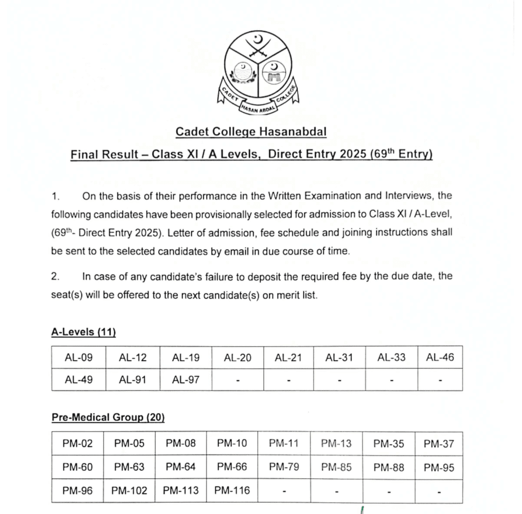 Congratulations to the candidates who have been provisionally selected for Class 1st Year/A-Level 2025 (69th Entry), subject to the completion of documentation.