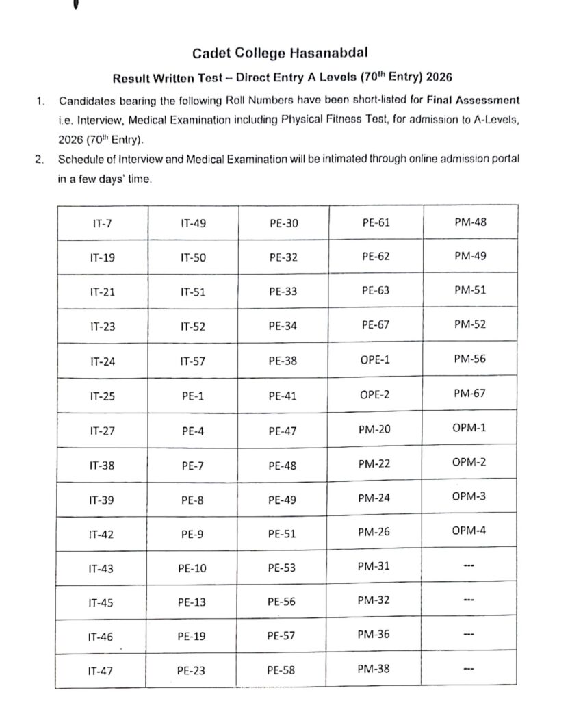 Candidates bearing the following Roll Numbers have been short-listed for Final Assesment i.e. Interview, Medical Examination, including Physical Fitness Test, for Admission to Class Direct Entry A-Level (70th Entry) 2026.